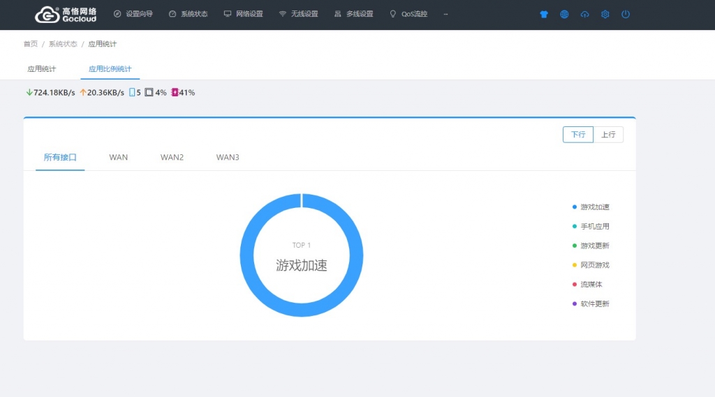 直接点应用比例统计会显示百分百的游戏加速,刷新几次就正常了。但是感觉这个正常了也感觉没正常,游戏怎么会占百分之四十呢,难道这个占比是看时间来的么,游戏时间占百分之四十这倒是有可能的(大学宿舍)。