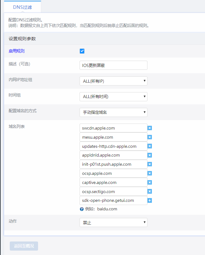 admin 发表于 2020-2-6 14:16 估计要抓相关苹果更新的域名, 然后到行为管理--》DNS过滤, 过滤掉这些域名 ...