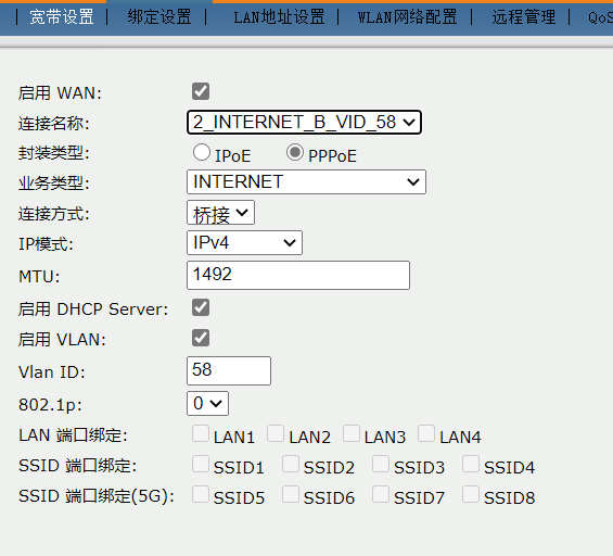 这里通通绑定VLANid=5,因为高恪的wan口VLAN id就是5