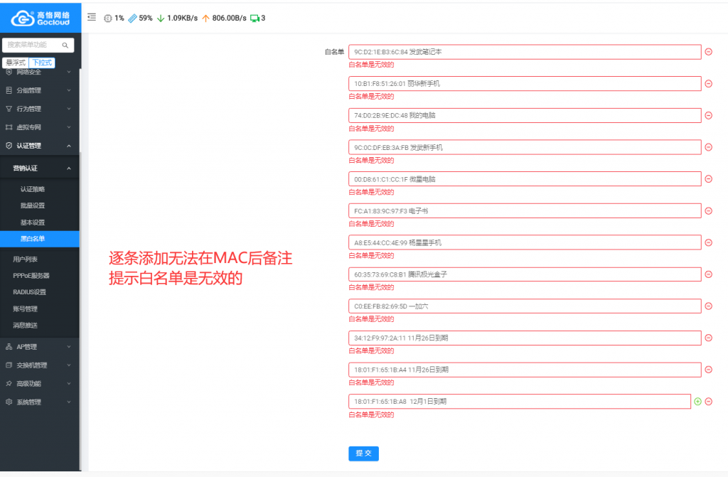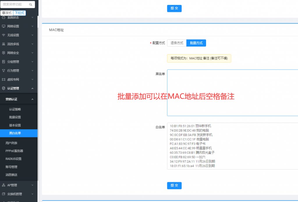 K2P的最新版固件,在营销认证——黑白名单功能下,添加白名单MAC时,逐条添加在后面备注的话会提示无效,不可添加,只能在批量添加页面才能在MAC后空格备注