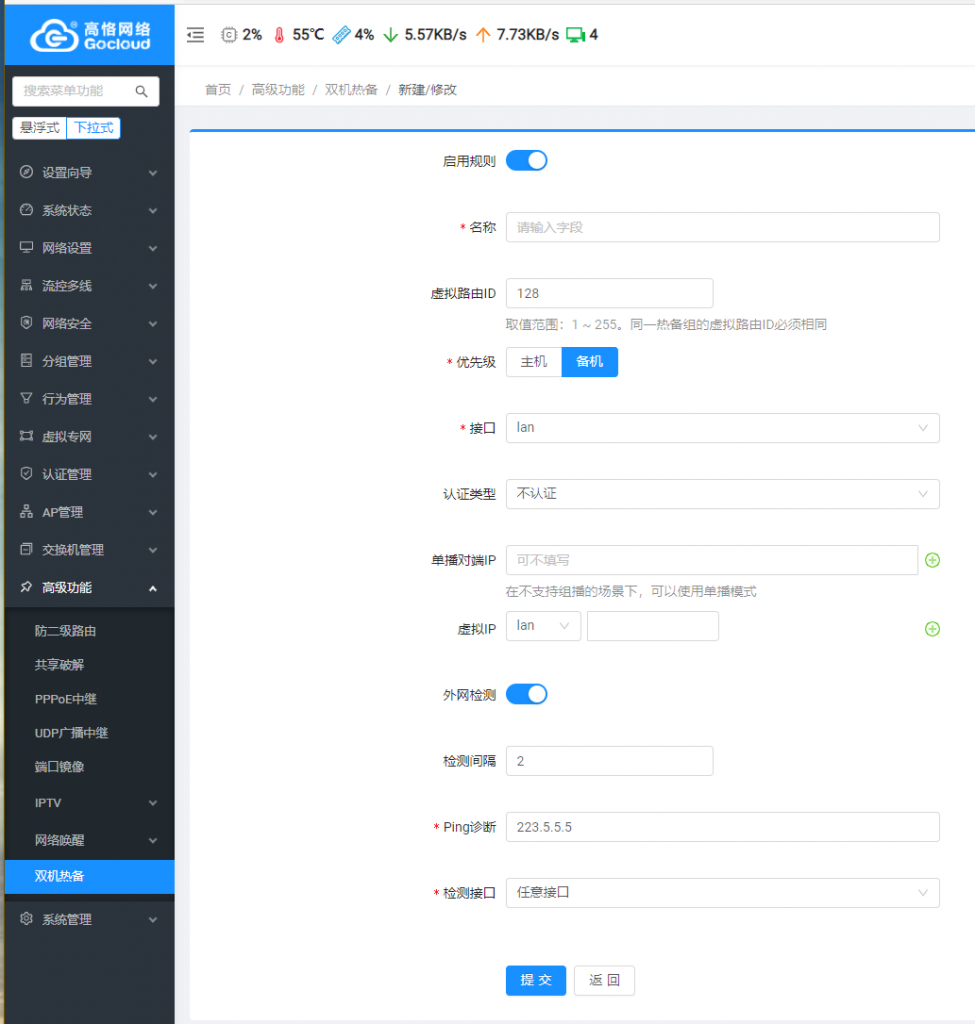 中间连一根心跳线,实现双机主备模式,或其中一个服务器外线断网,用户自动切换另一个服务器,这个功能很实用。