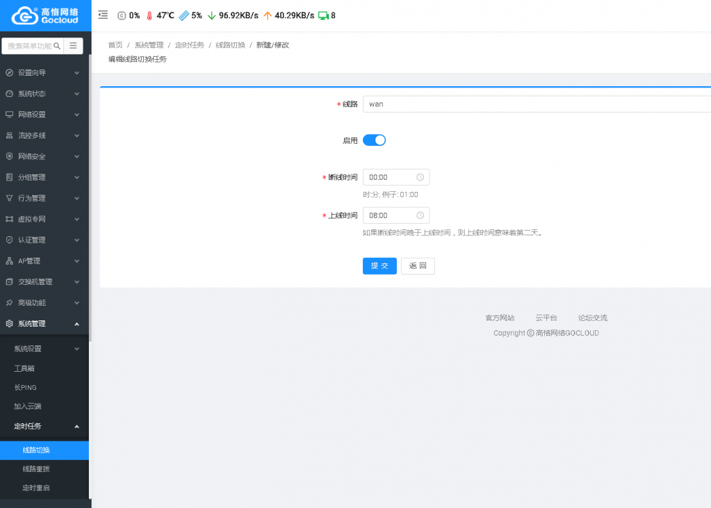 线路切换 (Line Switching): 线路切换的功能是为了解决在某些特定时间段内,网络线路发生变化时(如网吧的光纤专线在午夜12点断网)使用户的连接受到最小化的影响。通过在断网前一小时开始切换,将新的连接导向备用线路,以减少用户感知到的连接中断。