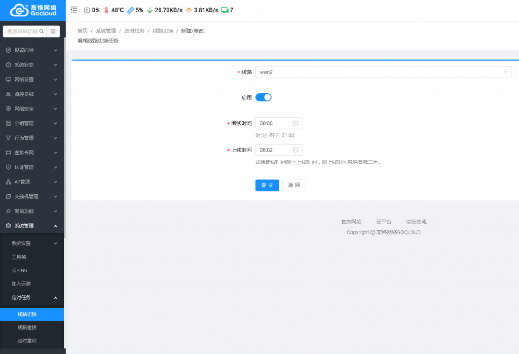 重拨 (Reconnection): 重拨是指运营商策略中设置的网络连接周期性断开再连接的过程。为了减少因重拨引起的网络中断,可以使用线路切换功能提前调度流量。