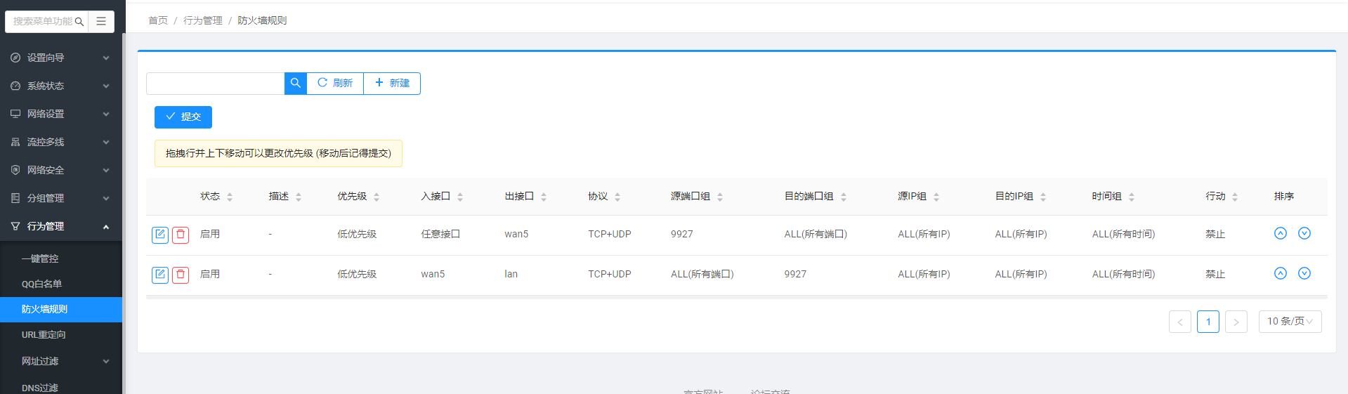 那么一旦映射了端口,再想停掉上传,该怎么办呢? 建议先关闭下载器,然后(行为管理--防火墙规则)配置这两个规则 (映射的那个端口号,就在端口组哪里填对应的端口号)