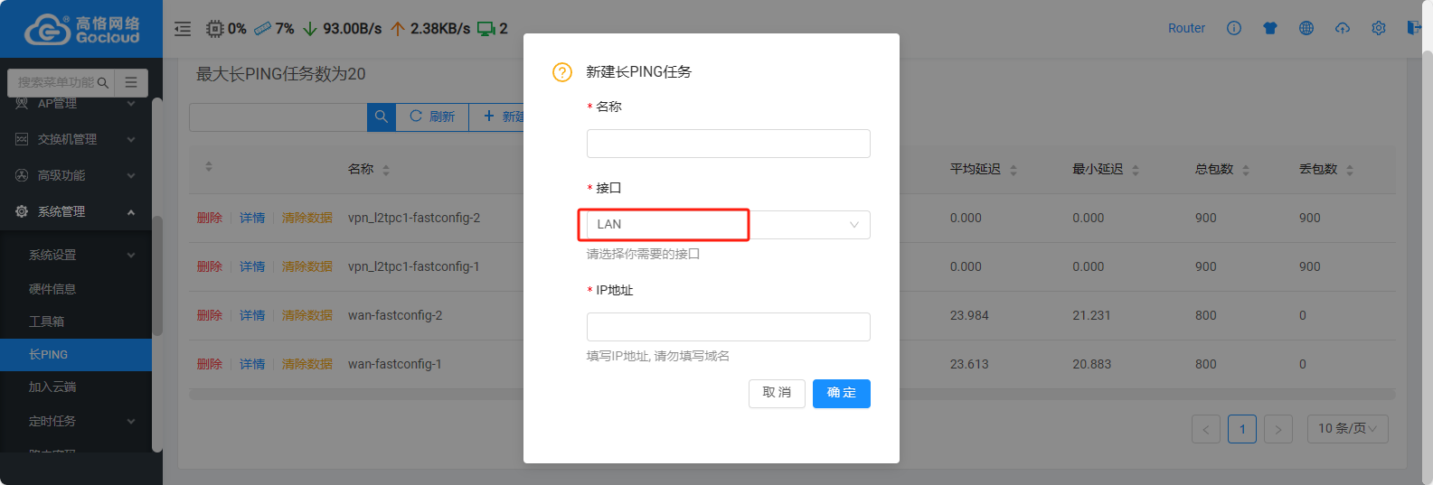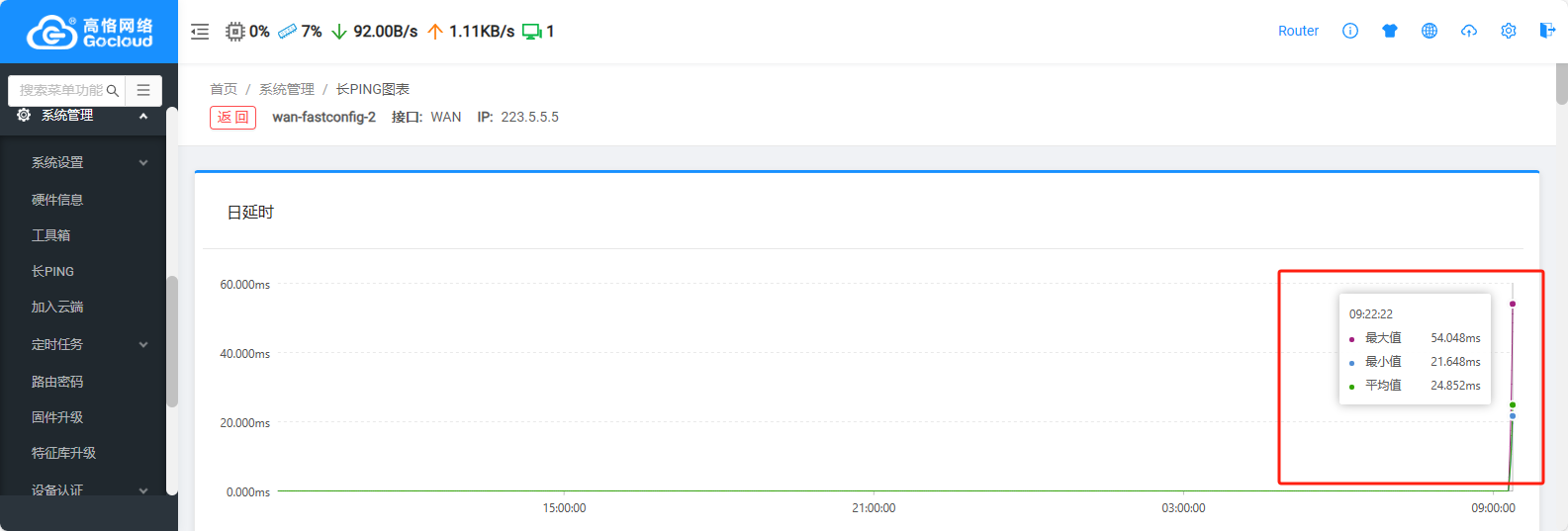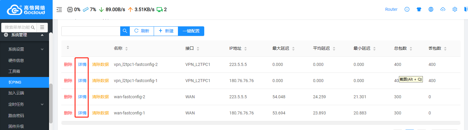 然后查看ping内网和ping外网的长ping规则的详情, 如果同时点出现高延时, 基本就可以判断路由本身负载很高, 建议更换硬件。