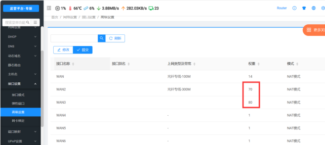 把wan2的权重调高后,如图4; 在【流控多线】【多线策略】【应用分流】,关于大流量和网页的负载均衡模式改为实时连接数模式,如图5。 图4 修改接口权重