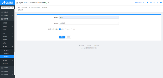 步骤四:根据你想要接口类型,和接口的名字选择你想要做的接口。需要注意的是,接口名称不能是中文,只能是lan2,wan2,wan3这类名字,接口名字不要重复。 例如,你想要多做一个lan口给wifi使用,那就在接口名称输入lan2,接口类型选择内网接口(接口类型的空白框最右边可以下拉选择内网接口或者外网类型),最后勾选一台网卡ETH的名字,这里我们选择eth1,再提交就可以了。如图5。(lan可以绑定多个eth接口1,这样的话,这几个接口都是同一网段) 图5